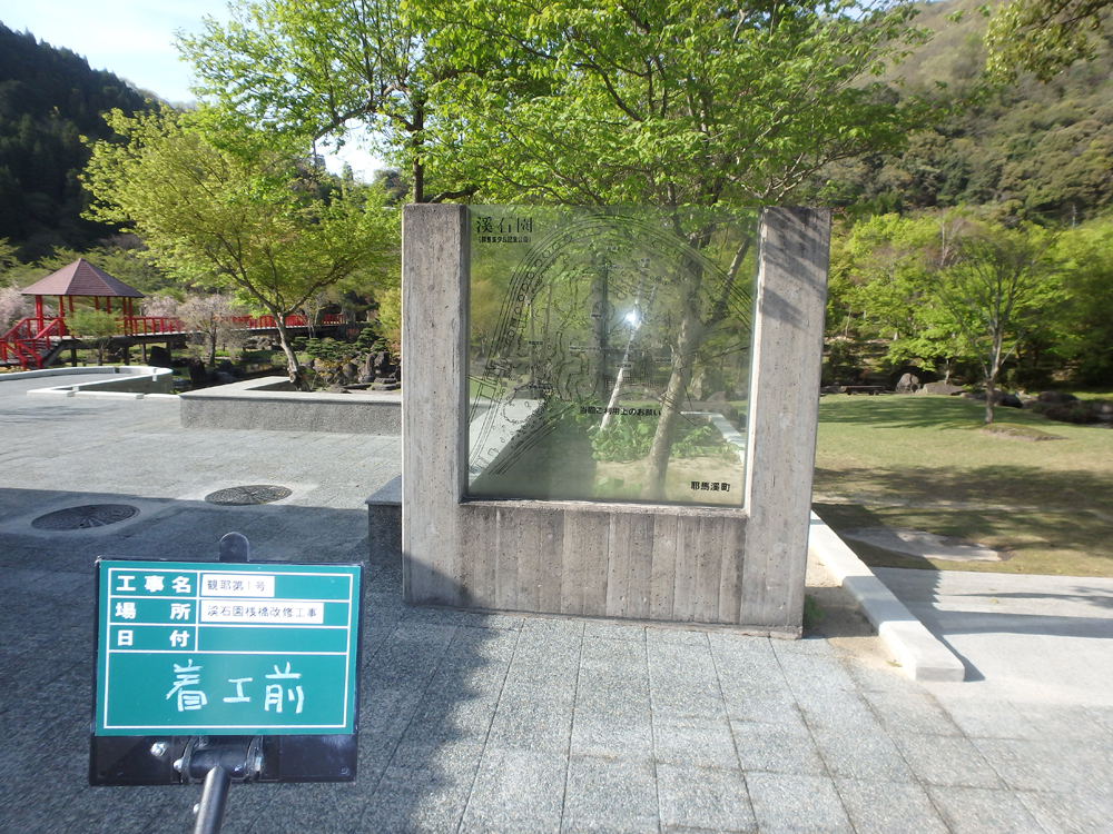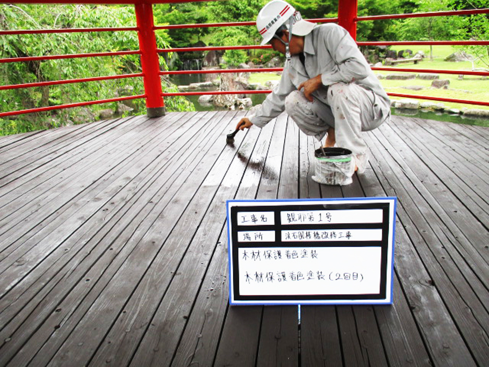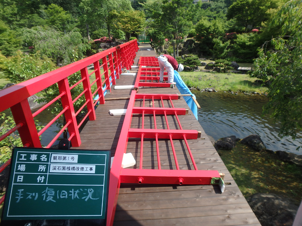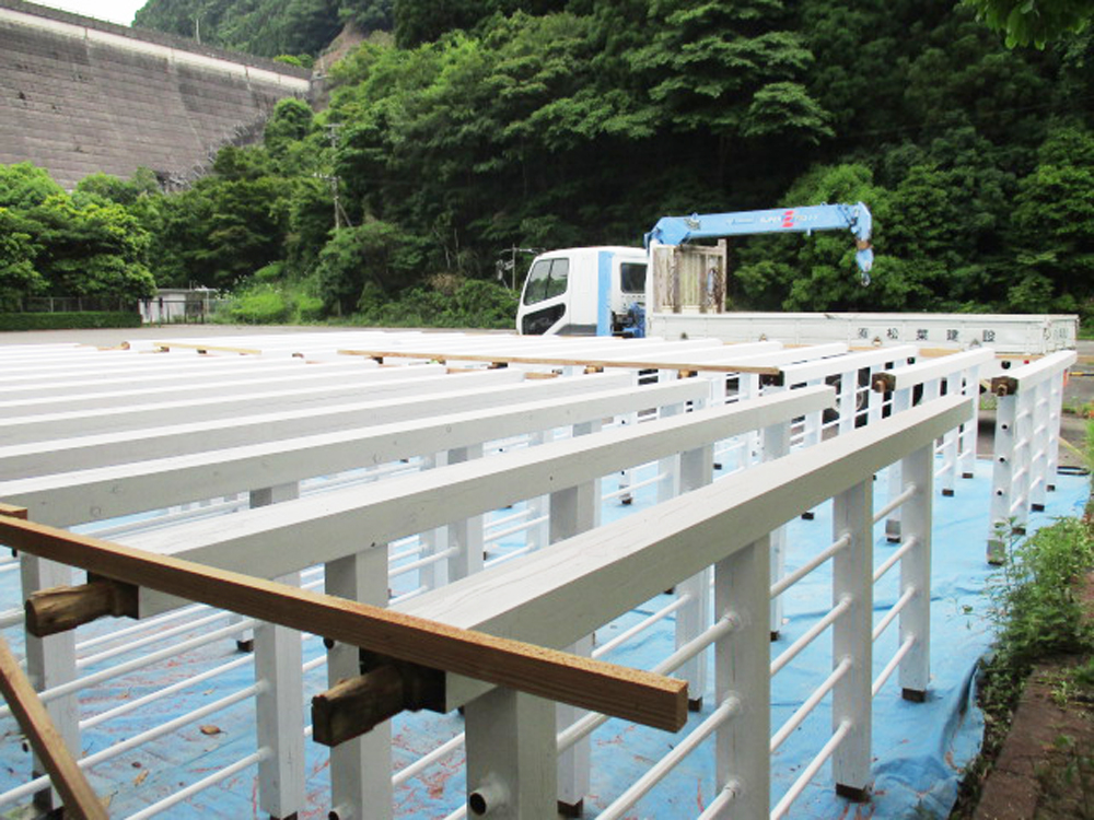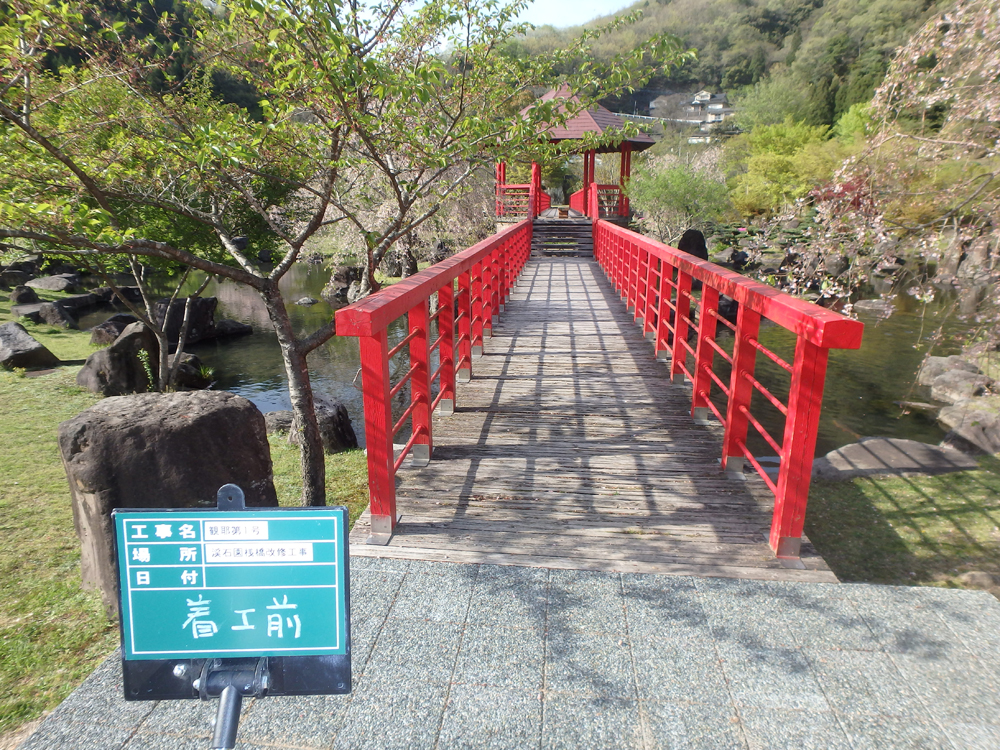 耶馬渓ダムの下にある公園にかかる桟橋の改修工事です。桟橋の床部分の老朽化に伴い既存の手摺を一時的に取外し床部分はすべて取替てすべての材料を塗装し直しました。合わせて入口のモニュメントも改修しました。