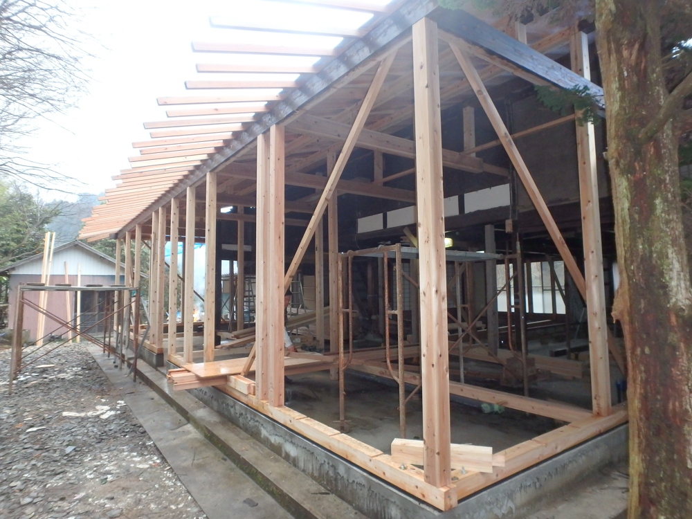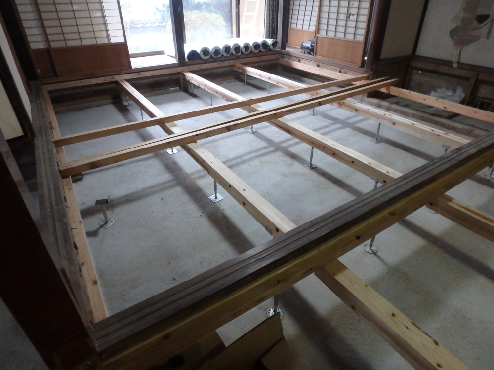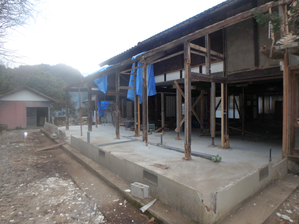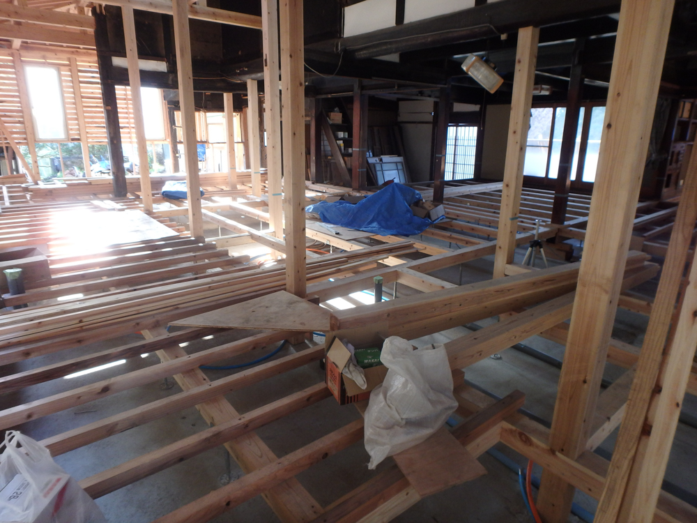 リフォームに先立ち、主たる土台・柱・梁のみを残し、土間コンクリート打設に始まり土台・柱・梁の補強を施してからの作業となりました。