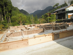 基礎が完成したら、上に土台(どだい)と呼ばれる材木を固定していきます。