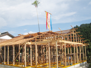 通常、柱・棟・梁などの骨組みが完成し、最後に最上部の棟木を上げるときに行う神事で、竣工後も建物が無事であるよう願って行われるものです。